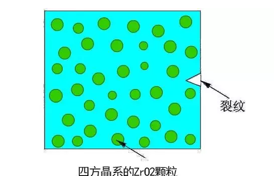 氧化鋯中四方相向單斜相的轉(zhuǎn)變可通過(guò)應(yīng)力誘發(fā)產(chǎn)生。當(dāng)材料受到外界拉應(yīng)力時(shí),基體對(duì)ZrO2的壓抑作用得到松弛,ZrO2顆粒即發(fā)生四方相到單斜相的轉(zhuǎn)變,這種相變將吸收能量而使裂紋尖端的應(yīng)力場(chǎng)松弛,增加裂紋擴(kuò)展阻力,從而大幅度提高陶瓷材料的韌性。