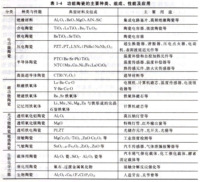 功能陶瓷是指以非力學(xué)性能(如電、磁、熱、化學(xué)、生物等性能)為主的陶瓷磚B=有些陶瓷材料既是結(jié)構(gòu)材料也是功能材料,如2r02、A12 03、SiC等。功能陶瓷制品具有品種多、應(yīng)用廣、更換頻繁、體積小、附加值高等特點(diǎn),主要有金屬氧化物和Ba、Pb、Mg及Sr的鈦酸鹽等,表1-4簡要介紹幾種主要功能陶瓷。